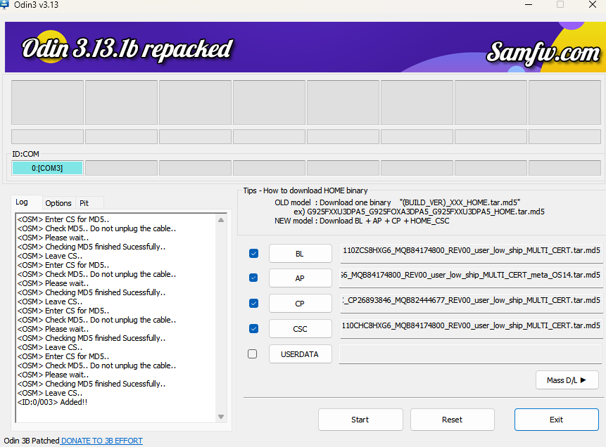 当 Odin 左上角显示绿色的 PASS! 字样时,表示刷机成功。 手机会自动重启。